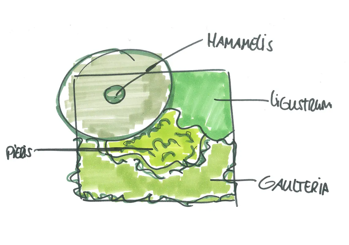 De Gaultheria kan heel mooi gecombineerd worden met heesters. Roy stelt de volgende combinatie voor in de border:
