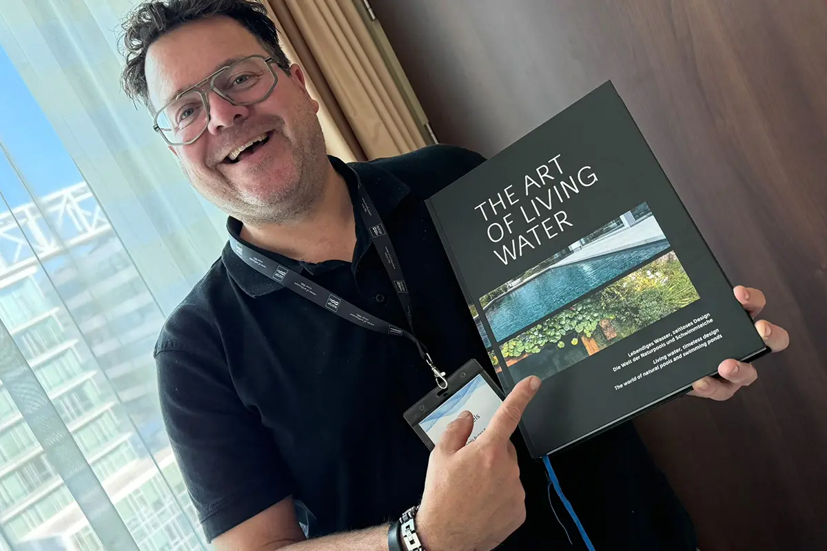 Roy mocht namens ons in vijf minuten presenteren waarom juist dit project de titel verdiende. Voor een zaal met 120 internationale vakgenoten vertelde hij over de kracht van rust, eenvoud en natuurlijk evenwicht in een moderne omgeving. Over het vakmanschap en de verfijnde afwerking die onze tuinen kenmerken en over de magie van een natuurlijk zwembad dat volledig biologisch wordt gefilterd, zonder chloor of zout.