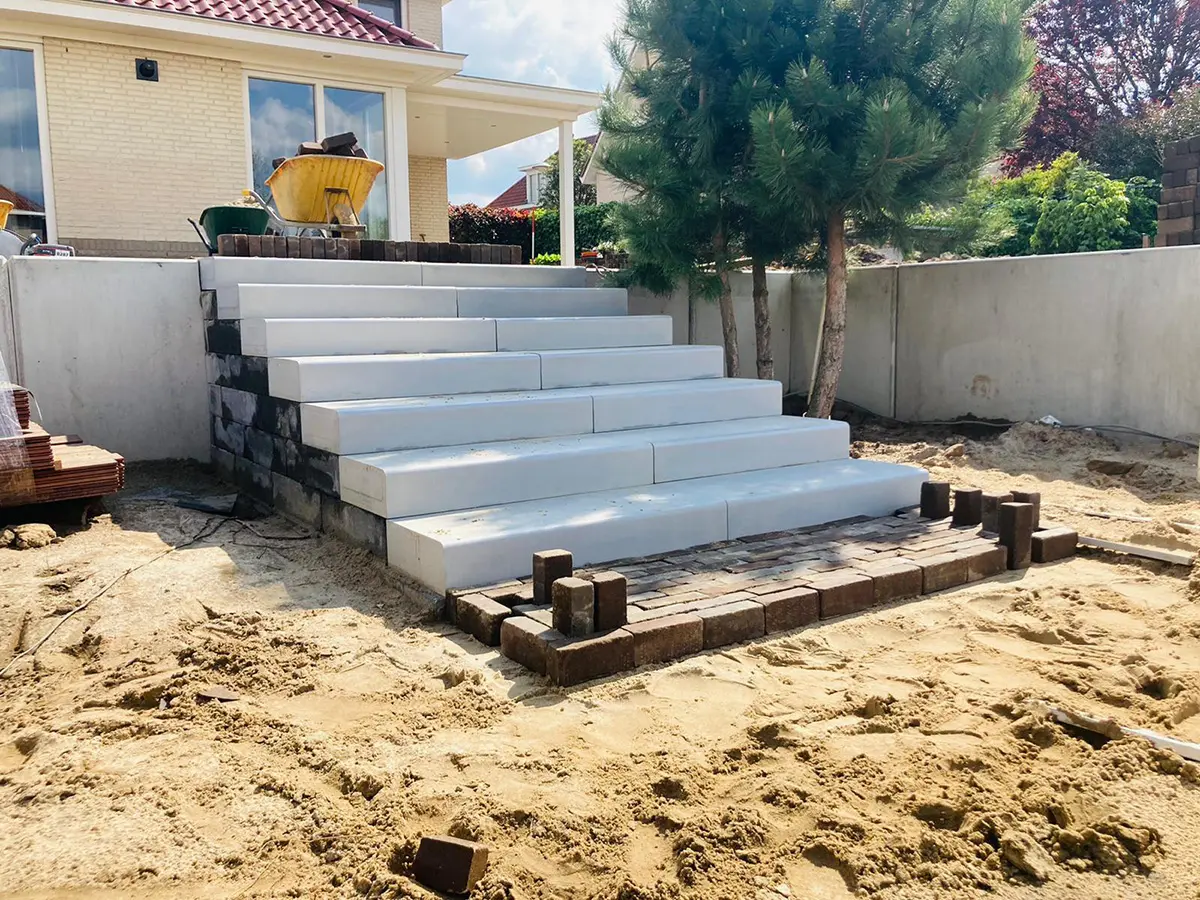 Een belangrijk uitgangspunt was het bestaande hoogteverschil tussen woning en waterlijn. In plaats van dit te verbergen, hebben we het juist als kans benut. Het niveauverschil in deze moderne tuin aan het water wordt elegant opgevangen met een brede trap van Mega Smooth traptreden. Deze robuuste, strak vormgegeven elementen zorgen niet alleen voor een praktische oplossing, maar dragen ook bij aan de moderne uitstraling van de tuin.