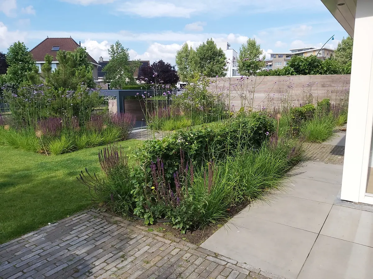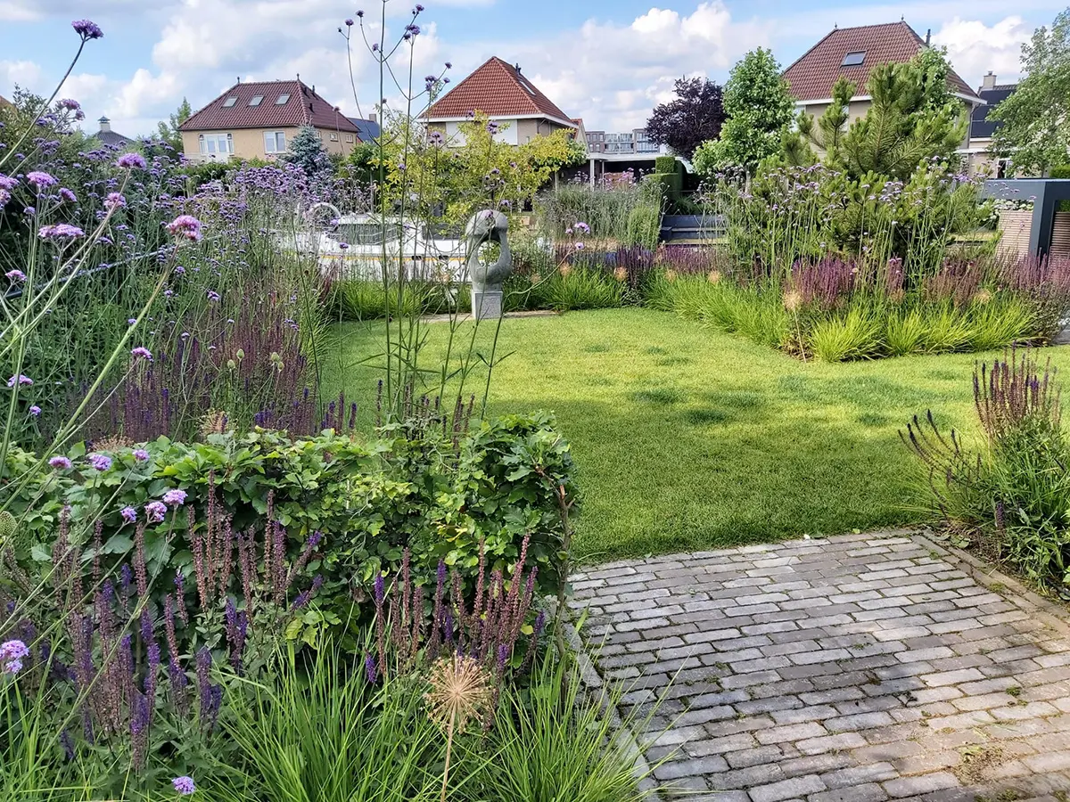 De beplanting in deze moderne tuin aan het water is zorgvuldig gekozen. Bloemrijke borders zorgen voor kleur en variatie door de seizoenen heen, terwijl siergrassen en vaste planten zorgen voor structuur en zachtheid. Dit zorgt niet alleen voor een levendige sfeer, maar trekt ook vogels, vlinders en bijen aan waardoor de tuin steeds in beweging is.