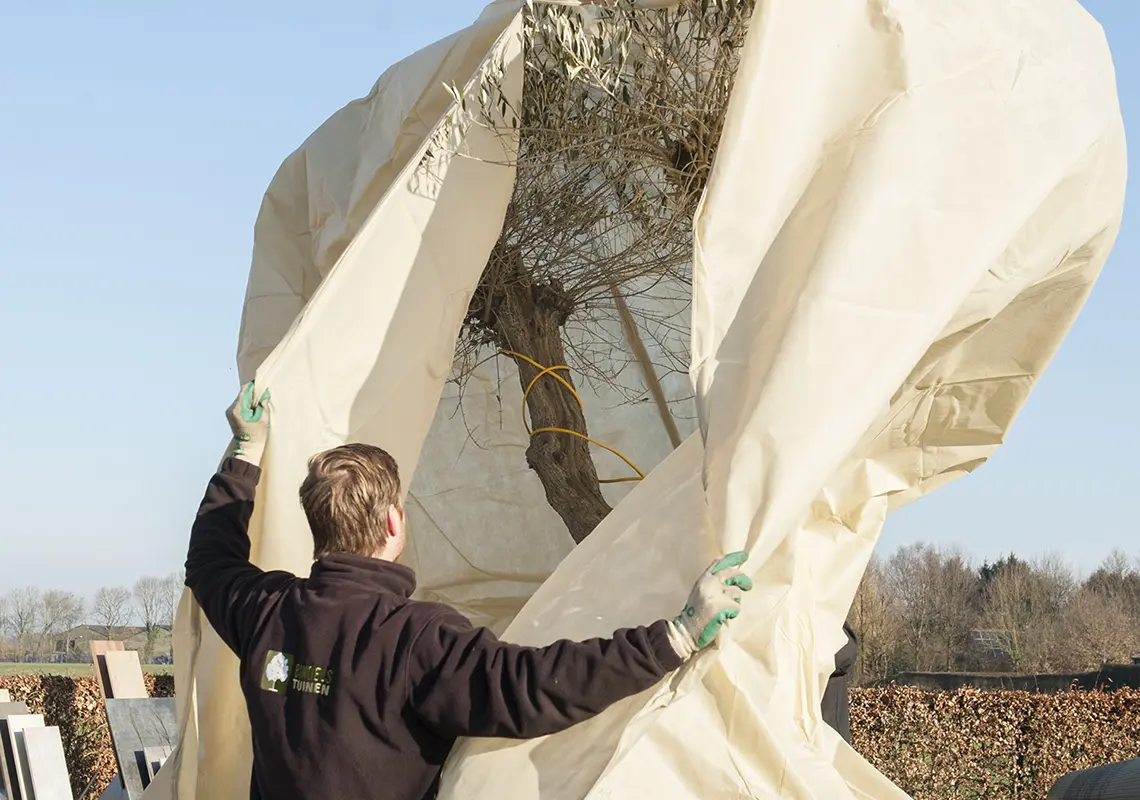 Daarna wikkel je de kroon van de boom in met een ademende beschermhoes of dik vliesdoek. Let op dat je hiervoor geen plastic gebruikt! Plastic ademt niet en kan juist condens veroorzaken, wat bij vorst leidt tot bevriezingsschade.
