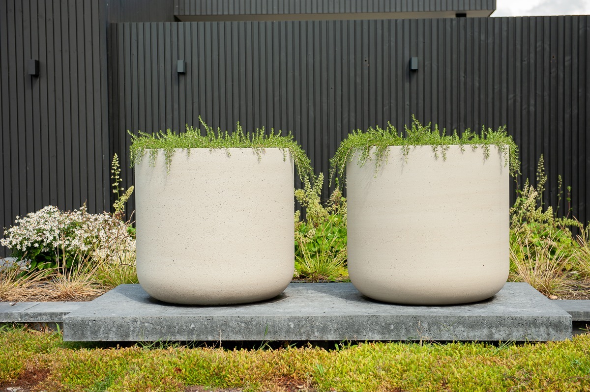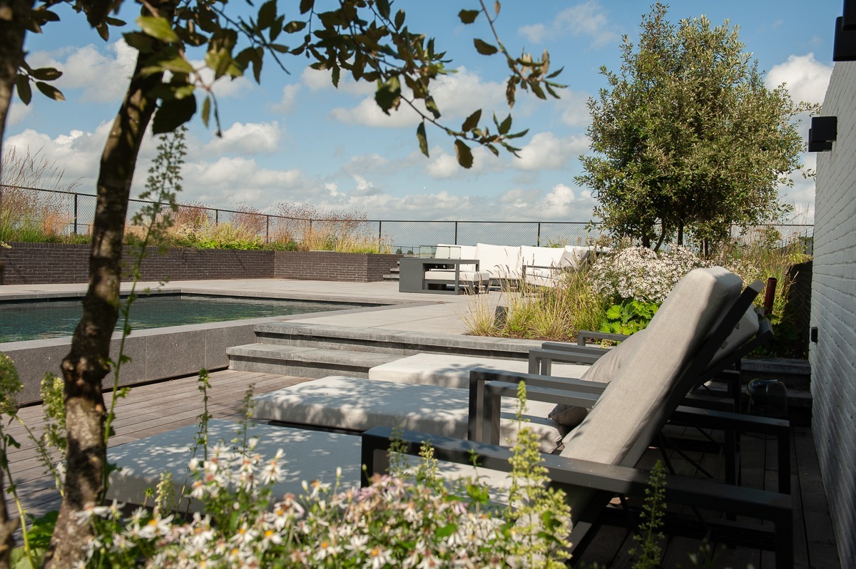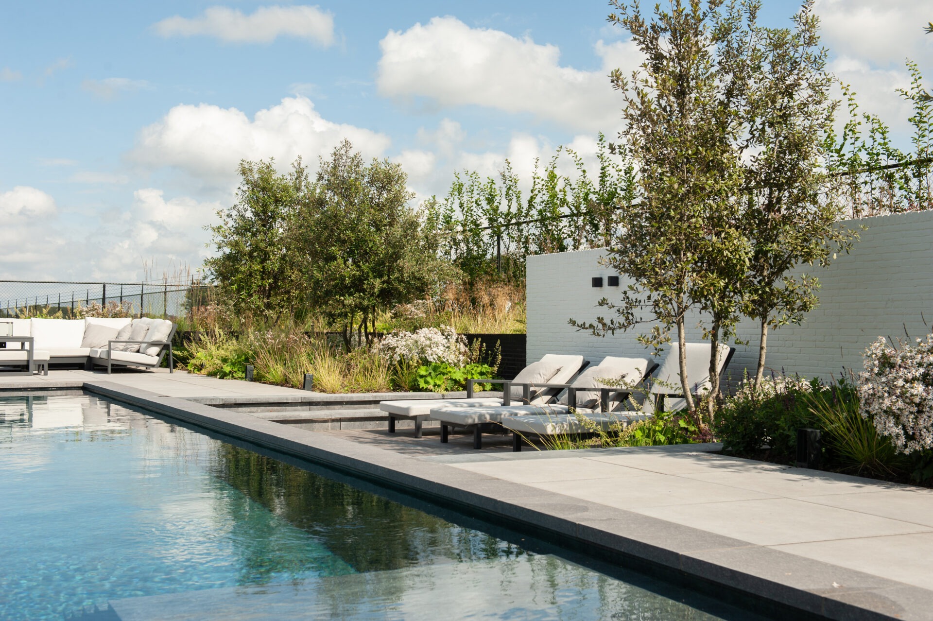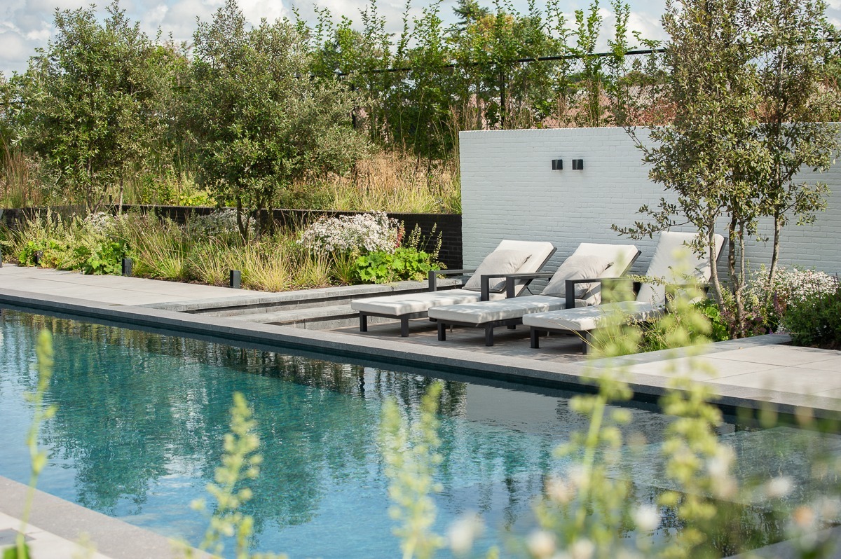 Een moderne lounge tuin waar natuurlijke elementen en luxe comfort samensmelten tot één geheel. Een plek om te ontsnappen aan de dagelijkse hectiek.