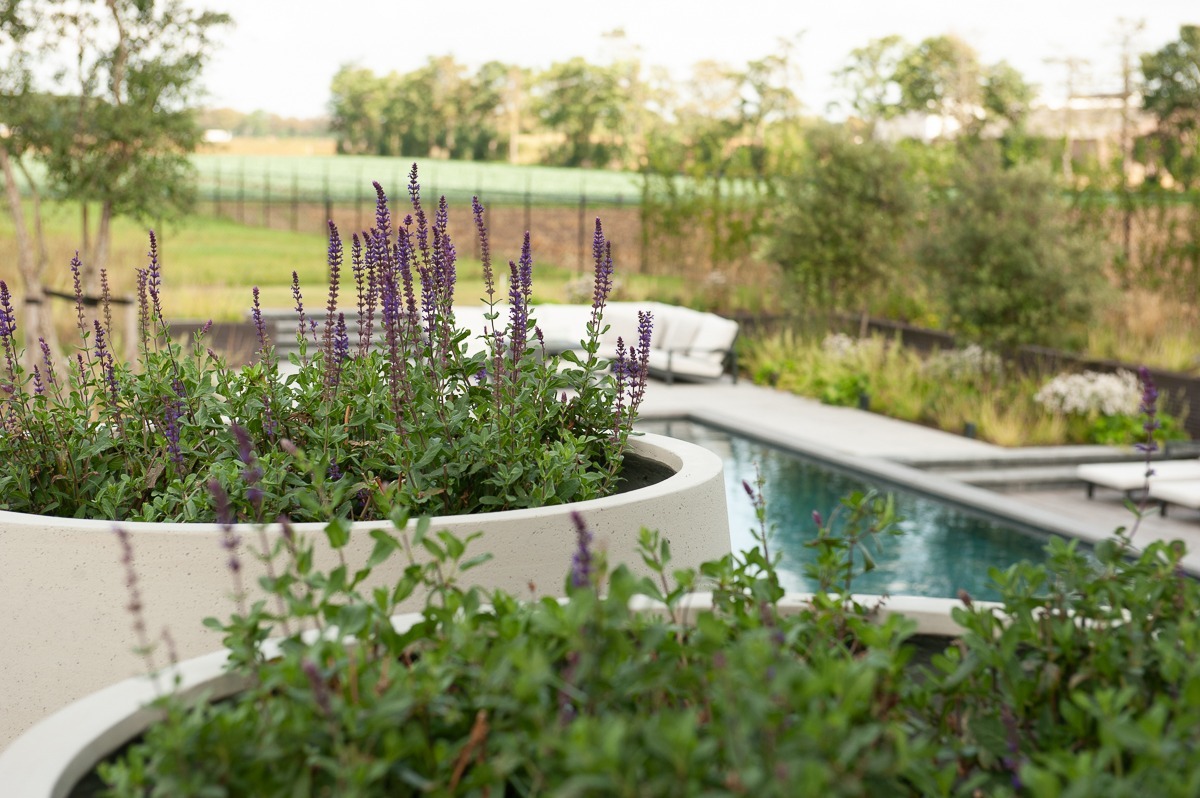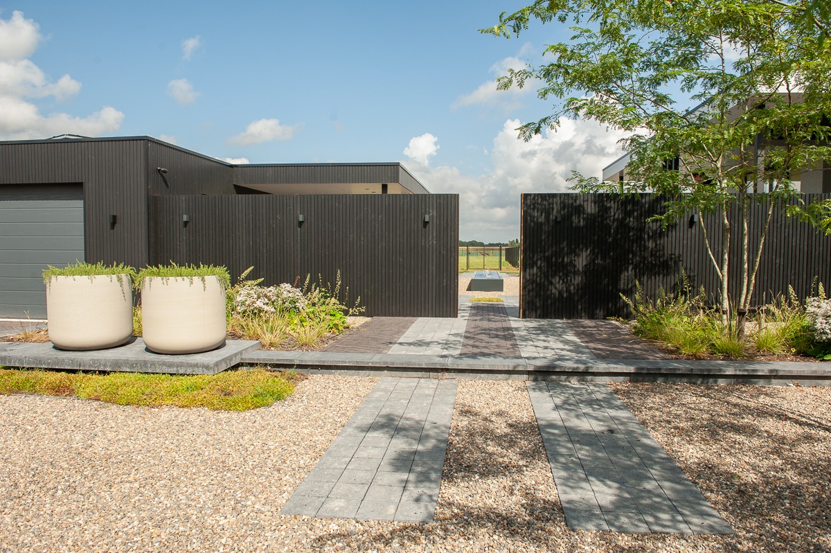 Het tuinontwerp is een subtiele ode aan hun agrarische verleden. Koeien, melk en ondernemerschap vormen de basis. Roy vertaalde dit verhaal naar een elegant karrenspoor, verfijnd uitgevoerd in bestrating, waar historie en hedendaagse luxe elkaar vanzelfsprekend ontmoeten.