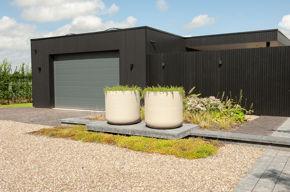 Het bijgebouw is meer dan een praktische opbergruimte voor tuinmachines, fietsen en gereedschap. Uitgevoerd in zwart hout heeft het een rustige, luxe uitstraling en vormt het een subtiel architectonisch element in de tuin. Door de rijke, weelderige beplanting rondom verzachten de lijnen en gaat het gebouw volledig op in zijn groene omgeving. Zo blijft functionaliteit aanwezig, zonder afbreuk te doen aan de natuurlijke rust en uitstraling van de tuin.