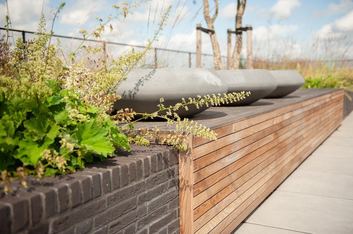 Verspreid door de tuin zijn verschillende zit-, lounge- en relaxplekken gecreëerd. Terrassen in zon of schaduw, beschut uit de wind en comfortabele ligbedden zorgen ervoor dat de bewoners op elk moment van de dag hun ideale plek vinden.
