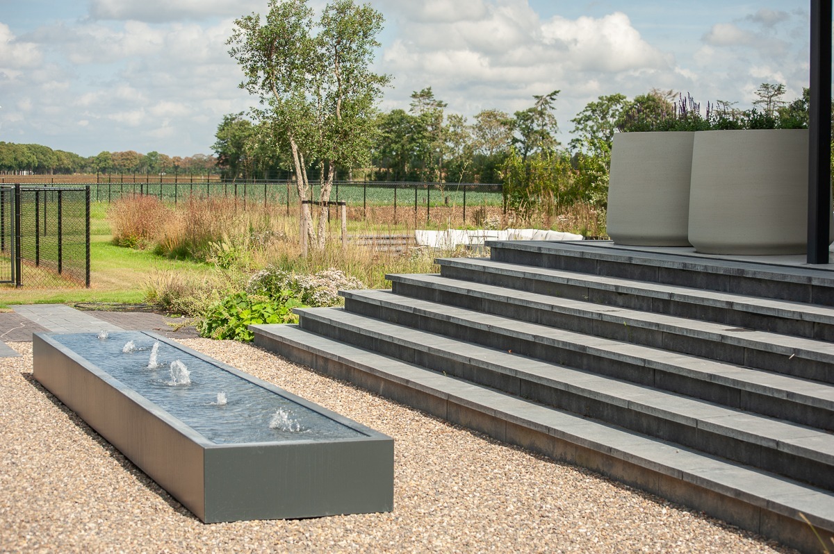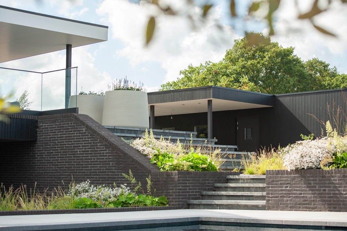Het natuurlijke hoogteverschil in de tuin is stijlvol benut met meerdere trappen. Rondom de woning zorgen statige trappartijen voor rust en overzicht, waarna een tweede trap de overgang maakt naar het zwembad en de tuin vloeiend laat doorlopen.