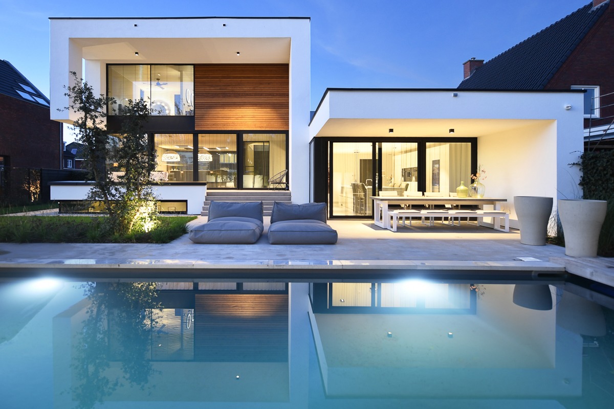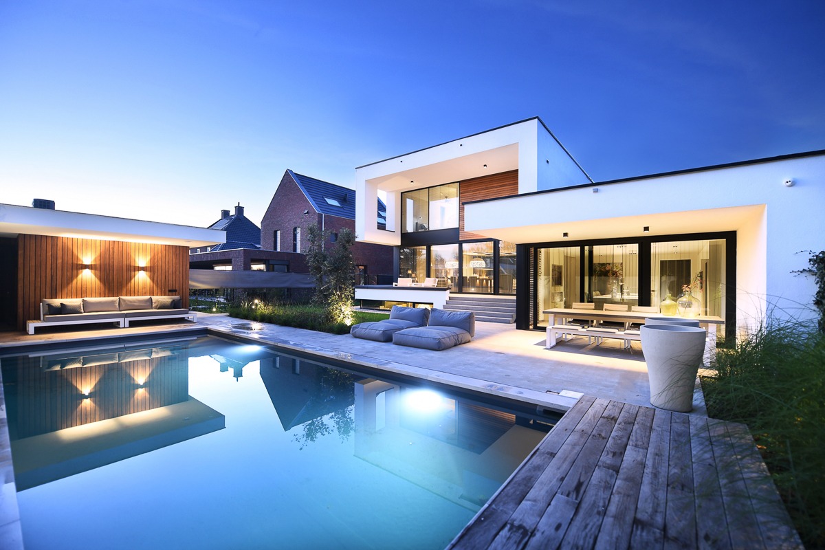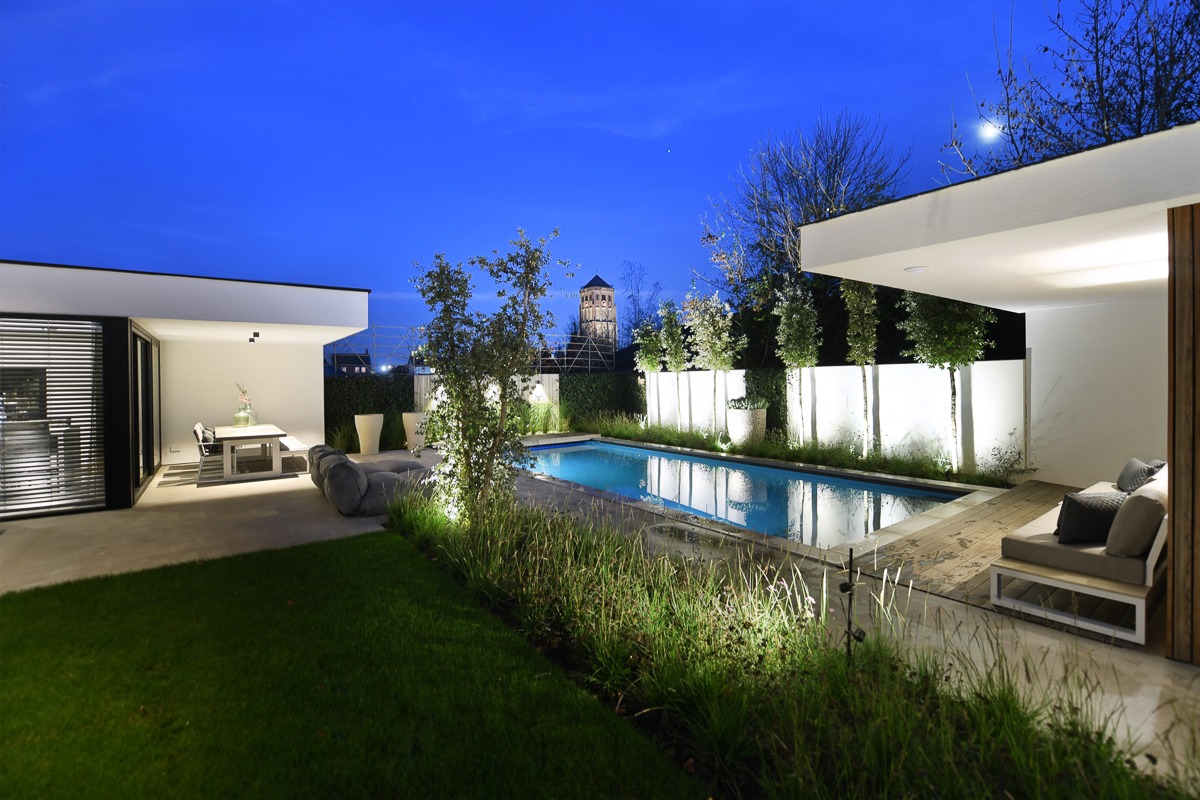 Water vormt hier het stille middelpunt. Strak geïntegreerd in het ontwerp, royaal van formaat en perfect in verhouding tot de woning. Overdag weerspiegelt het de lucht, ’s avonds brengt het sfeer en diepte. Een plek waar je zwemt, ontspant en samenkomt.