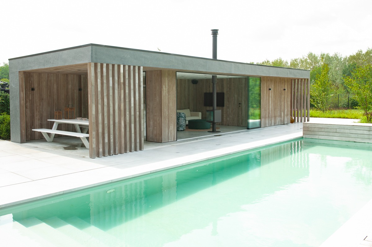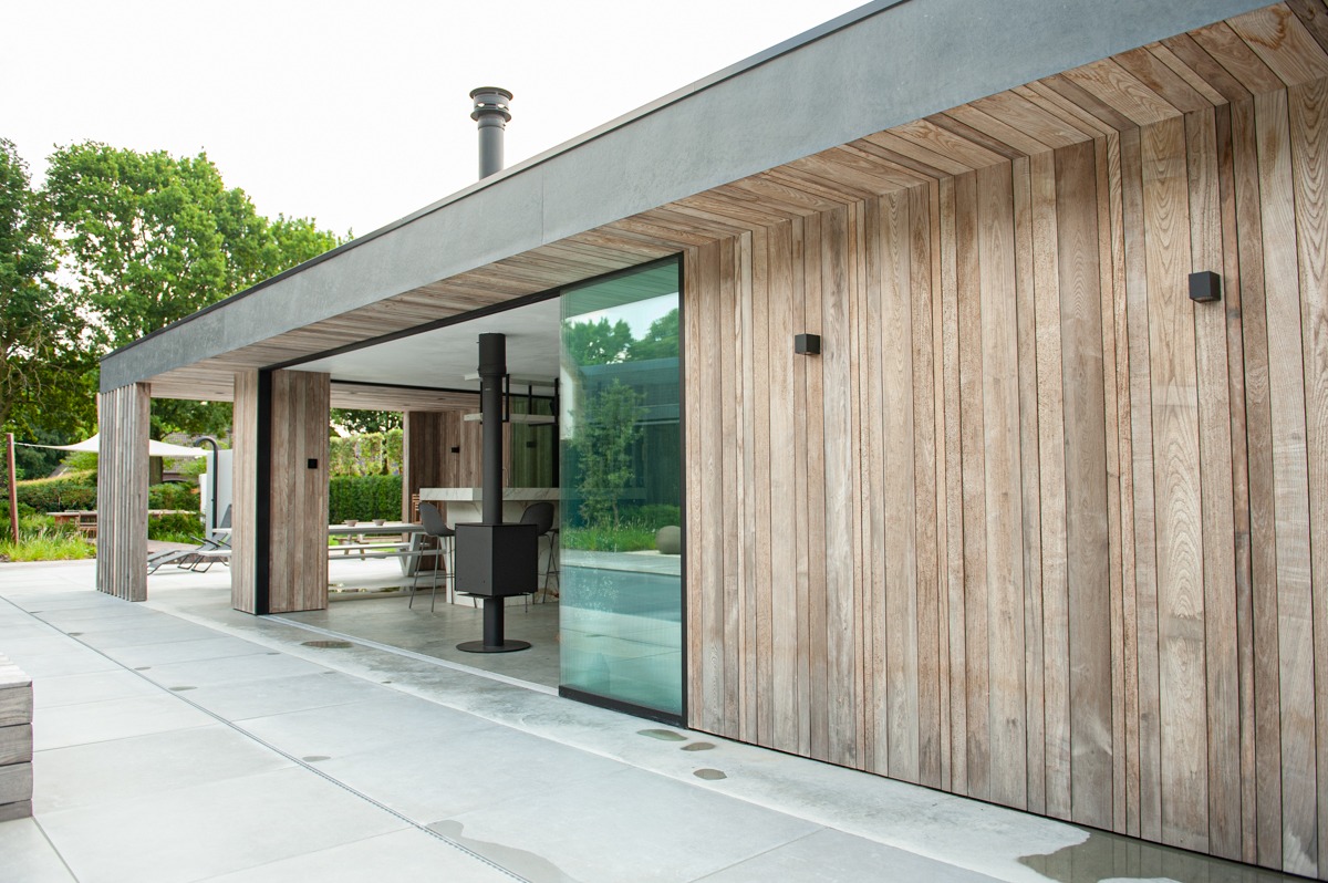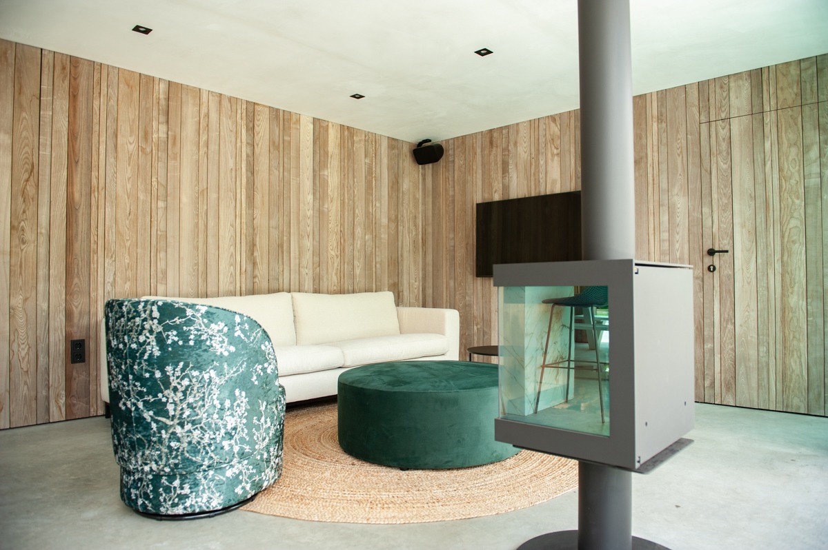 Het poolhouse is meer dan een bijgebouw, het is een volwaardige leefruimte. Met glazen schuiframen die binnen en buiten naadloos verbinden, een bar met spoelbak en koelkast, een toilet en een sfeervolle kachel voor de koelere avonden. Alles is afgewerkt in duurzaam Hotwood essen, wat warmte en karakter toevoegt aan het strakke ontwerp. Hier verleng je de zomer moeiteloos en geniet je in elk seizoen van het ultieme buitenleven.