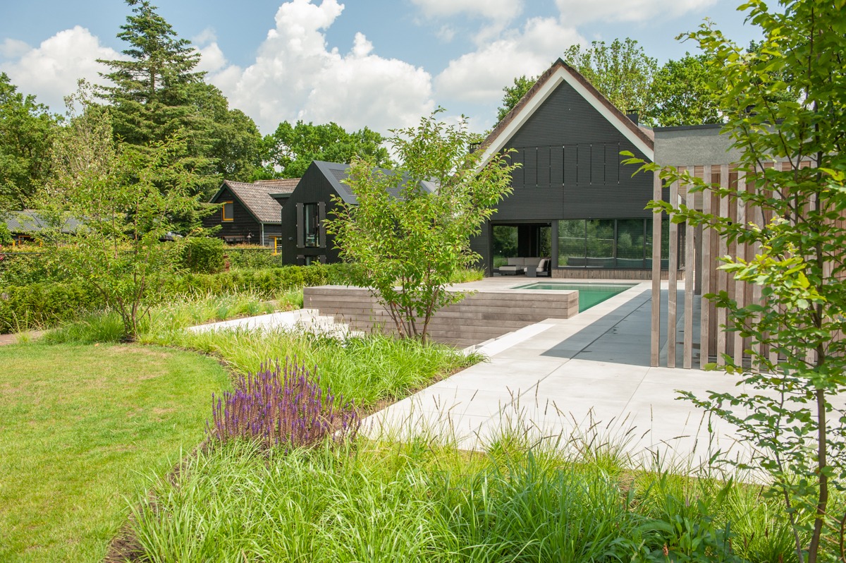 De wens was helder: een zwembad als kloppend hart van de tuin, met maximale beleving én privacy. Roy positioneerde het bad bewust pal voor de woning, zodat er altijd zicht en directe verbinding is met het water. Achter het zwembad ontwierp hij een verzonken zitkuil die beschutting en intimiteit biedt. Zo ontstaat een natuurlijke scheiding: kinderen vrij in het water, ouders ontspannen in alle rust, maar altijd dichtbij.