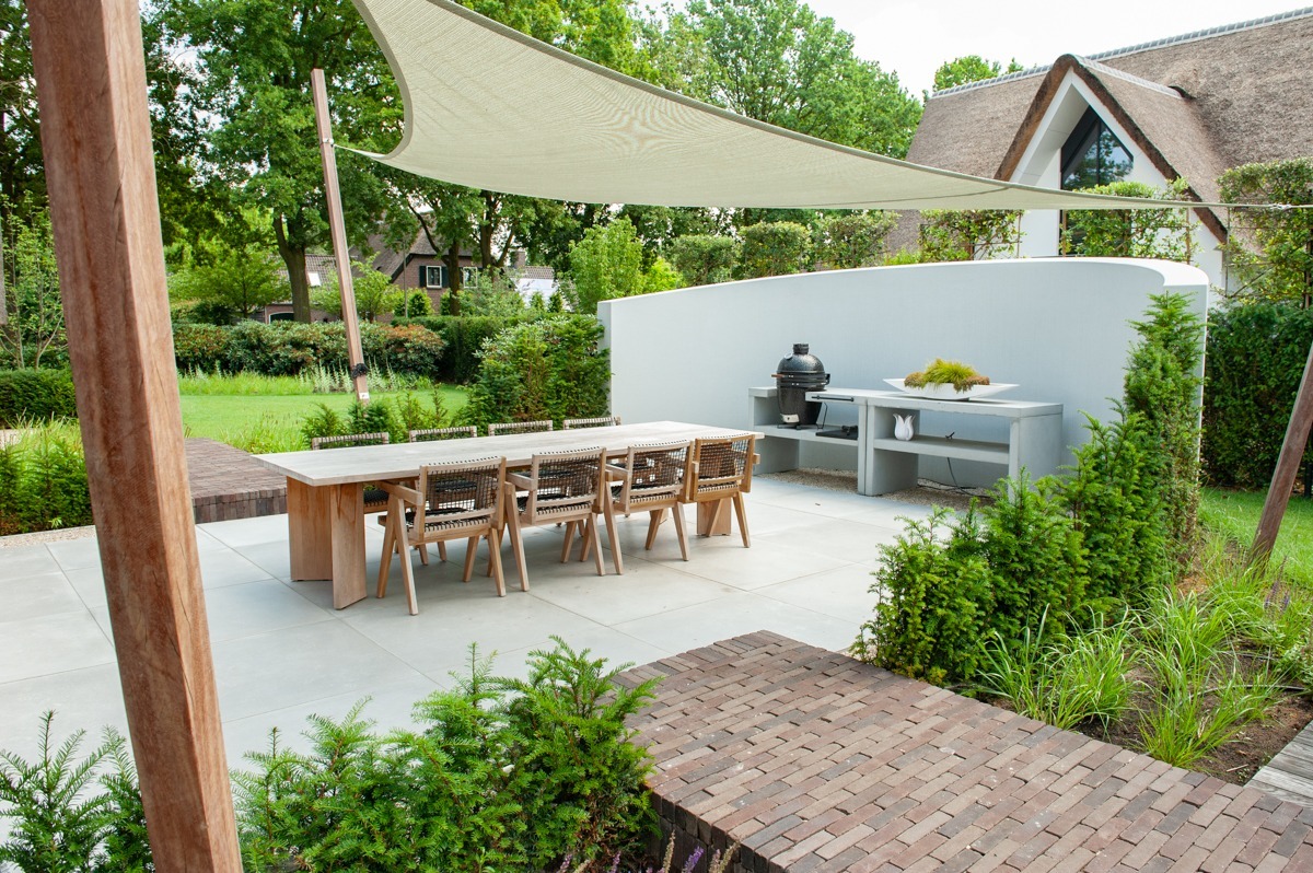 Via de openklapdeuren van de keuken stap je zo het terras op, waar binnen en buiten moeiteloos in elkaar overlopen. De composiete afscheiding met geïntegreerde buitenkeuken vormt een strak en stijlvol decor voor lange zomeravonden. Onder het schaduwdoek ontstaat een beschutte plek waar je comfortabel zit, zelfs op warme dagen. Aan de royale tafel is ruimte voor acht personen, perfect voor diners met vrienden en familie. Hier wordt gekookt, gelachen en nagepraat, terwijl de tuin als groene omlijsting zorgt voor rust en privacy.