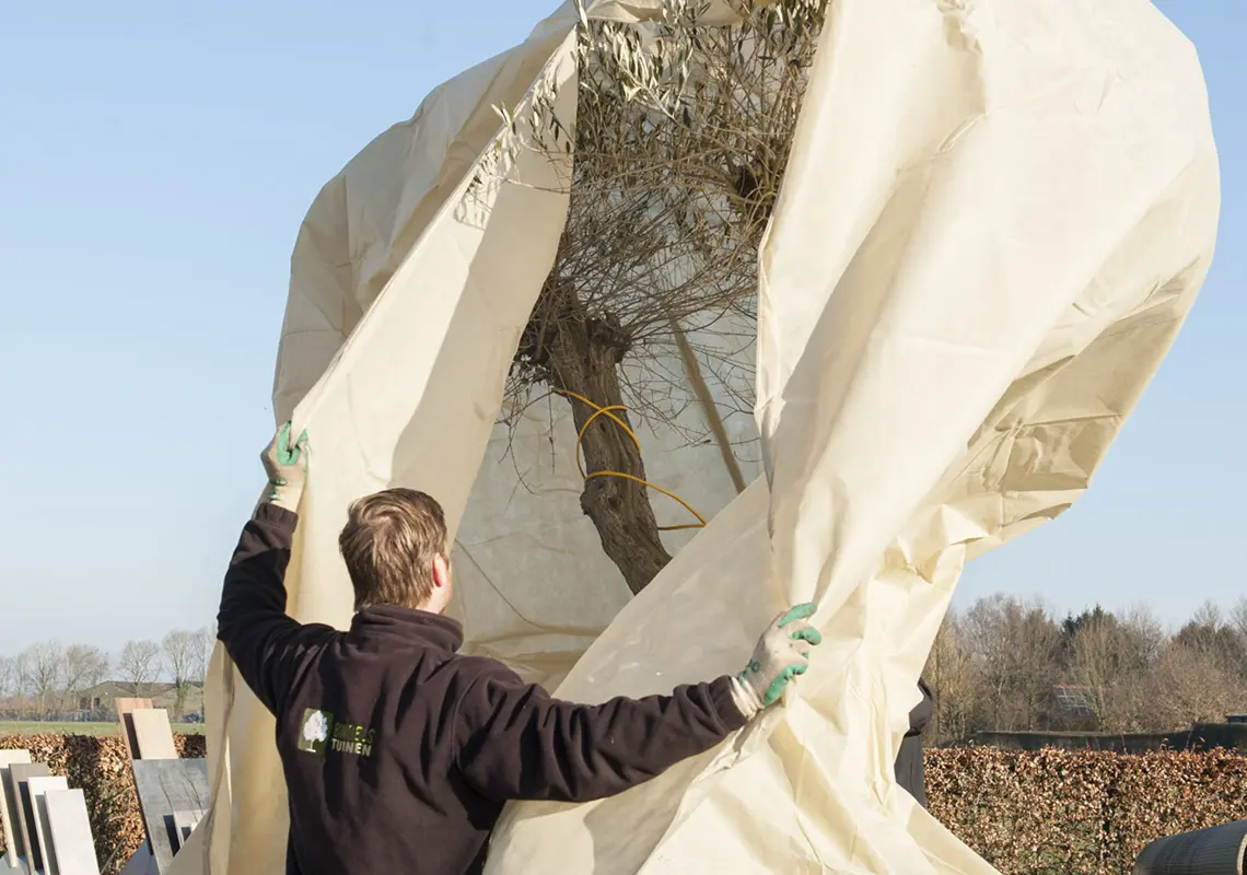 Zodra de temperaturen ’s nachts structureel boven het vriespunt blijven, mag je de hoes weer verwijderen. Laat de hoes niet de hele winter zitten tot het voorjaar, dan verstikt de boom en is de kans op schade alsnog groot.